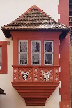 Das Gebäude besitzt an der Hofseite einen reich verzierten Erker mit Blendmaßwerk, für den sich ganz ähnliche Beispiele in Büdingen befinden. In das Maßwerk der Fensterbrüstung ist das Wappen des Grafen Heinrich von Ysenburg-Ronneburg und seiner ersten Gemahlin Maria von Rappoltstein eingefasst. Am benachbarten Treppenbau befindet sich ein Grundstein mit der Jahreszahl „1570“.[30]