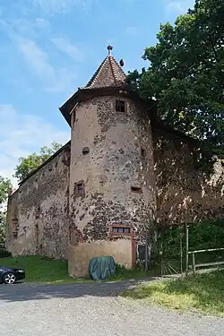 Für den südwestlich an den Marstall anschließenden Turmstumpf der hohen Umwehrung der Vorburg ist seit 1599 der Name „Hexenturm“ belegt, weil in diesem Jahr eine der Hexerei bezichtigte Frau dort eingesperrt wurde. Jahreszahlen auf einem spitzbogigen Portal im Untergeschoss und einer Schießscharte außen datieren die Bauzeit auf die Jahre 1550 bzw. 1549. Nur das Untergeschoss des außen halbrunden Turmes diente als Gefängnis. Oben trägt er eine Wehrplattform, auf der man recht gut die eigentliche Höhe der Vorburgmauer und die verschiedenen Typen von Schießscharten erkennen kann.[36]