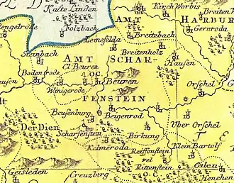 Burg und Burgbezirk Scharfenstein mit 14 Dörfern, zwei Klöstern und zahlreichen heute nicht mehr existierenden Orten wurden 1294 von den Grafen von Gleichenstein an Kurmainz verkauft.[16] Weit östlich der Burg gelegene Orte, wie Vollenborn wurden später vom Amt abgetrennt, Niederorschel war nur teilweise im Besitz der Erzbischöfe. Burg und Amt wurden nachfolgend zu einem Pfandobjekt der Erzbischöfe, die mehrere Pfandnehmer mit der der Burg belehnten. 1412 belehnte der Kurfürst belehnte die Herren von Wintzingerode mit einem Großteil der Burg und des Amtes, die es dann über 200 Jahre innehatten. Nach einer Fehde des Erzbistums, der Landgrafschaft Hessen und der Wettiner gegen Hans von Wintzingerode im Jahr 1415 konnte das Stift die Kosten für den Einsatz der Wettiner nicht bezahlen und verpfändete die Hälfte der Burg an die Wettiner.[17]