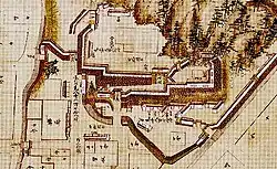 Da der Platz beschränkt war, wurde die Nebenresidenz (上屋敷, Kamiyashiki) auf dem Hang über der Hauptresidenz angelegt. Das erhalten gebliebene Gebäude für die Teezeremonie, Jūentei (聚遠邸) genannt, erhielt der 9. Daimyō Wakizaka Yasuori (脇坂安宅; 1809–1874) von Kaiser Kōmei, der es für dessen großen Einsatz als Verwalter der Stadt Kioto hierher versetzen ließ.[A 1]