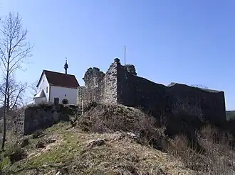 ![]() Burg Veringen – Ansicht der Bergfriedruine und der Kapelle St. Peter dahinter | ||