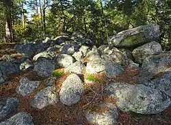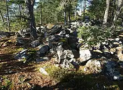 An den unteren Hängen des Berges im Westen, Norden und Osten gibt es Mauern, die etwa 100 m lang waren, 1,5 bis 4 Meter breit und fast 0,6 Meter hoch sind. Im Süden sind sie zusammengebrochen. Die westliche Mauer ist eine Doppelmauer mit zwei 22 Meter und 17 Meter langen Abschnitten, im Abstand von etwa 10,0 Metern. Die östliche Mauer hat auch zwei Abschnitte. Sie sind 10 bzw. 50 Meter lang und haben den einzigen etwa 15,0 Meter breiten Zugang. Im Hang gibt es eine untere Außenwand, die etwa 10 Meter lang ist und aus einer Reihe von abgewinkelten Steinen und Blöcken besteht.