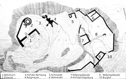 Der mächtige vierstöckige Wohnturm der oberen Kernburg mit seinen zwei Meter dicken Grundmauern war der zentrale Bau der Anlage. Er war über einen Hocheingang zugänglich und ab dem zweiten Stockwerk wohnlich eingerichtet. Neben Fensternischen sind Spuren eines Rauchabzugs erkennbar.