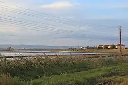 Burgas (Satellitenfoto) – Ein Großteil der Stadt befindet sich zwischen den drei Seen und dem Schwarzen Meer (rechts).