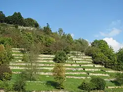 Am Südeck der Berghöhe liegt die Ruine der Burg der Herren von Steinheim. Hangteile dienen dem Weinbau.