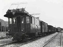 Anlässlich der Elektrifizierung der Langnauer Linie der EB wurde der Triebfahrzeugpark mit den Triebwagen BCe 2/5 Nr. 7 und 8 ergänzt[4]. Die 1921 von der Maschinenfabrik Oerlikon (MFO), der Schweizerischen Industriegesellschaft (SIG) in Neuhausen am Rheinfall und der SLM gelieferten „Halblokomotiven“ waren eine Kombination von dreiachsiger Lokomotive mit Tschanz-Antrieb und einem aufgestützten Wagenteil mit einem zweiachsigen Drehgestell am anderen Ende. Sie ähnelten den 1925 von den gleichen Firmen als CFe 2/6 an die BLS-Gruppe gelieferten «Halbeseln», diese allerdings für Einphasenwechselstrom.