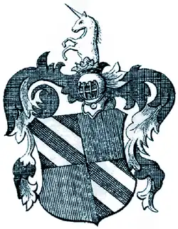 Quadrierter Schild. 1 und 4 je fünfmal rechtsgeschrägt in schwarz und Silber. 2 und 3 in Rot. Über dem gekrönten Helm ein wachsendes, rechtsgekehrtes Einhorn mit goldgelbem, aufrecht gerichteten Horn. Die Helmdecken sind schwarz und silbern.[2]