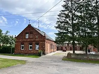 - Das ehemalige Gutshaus ist ein eingeschossiger Fachwerkbau mit Walmdach, das an der Tür auf 1740 datiert ist. Dahinter befinden sich Reste eines mittelalterlichen Wehrturms sowie auf einem Hügel die Reste eines kleinen, quadratischen Gebäudes, das von einem ringförmigen Wassergraben umgeben ist.[10]