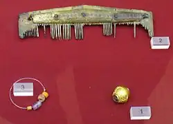 Bild 3 zeigt Gegenstände aus dem achsensymmetrisch zu Grab Nr. 10 aufgestellten Grab Nr. 1. Dieses Grab wurde zwar gestört, aber es fanden sich dort noch Grabbeigaben, wie der mit 1 bezeichnete Kopf einer goldenen Gewandnadel, die mit Almandinen verziert ist, und der mit 2 bezeichnete Knochenkamm.