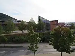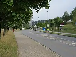 Entlang des zu dieser Zeit noch relativ unbebauten Abschnitts der Burgker Straße zwischen dem Stadion und der Einmündung der Rotkopf-Görg-Straße entstanden Reihen- und Mehrfamilienhaussiedlungen an den Straßen Am Dathepark, Pappermannstraße und Hellmuth-Heinz-Straße. Anfang 1993 eröffnete die Supermarktkette Allkauf einen Markt in Burgk mit 5500 Quadratmetern Verkaufsfläche, umliegenden Parkplätzen und einem Parkdeck.[28][29] Auf der gegenüberliegenden Straßenseite entstand in den Jahren 1997 und 1998 ein mit einer Glas-Holz-Fassade versehener Neubau für das Berufliche Schulzentrum für Technik und Wirtschaft Freital.[30]