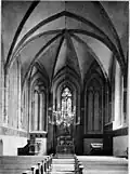 „Die Kapelle ist genau wie im Hochschlosse zu Marienburg mit zwei Kreuzgewölbenjochen und einem Dreiviertelstern, welcher ‚aus je zwei Diensten der Chorwand und der beiden Seitenwände entspringt. Die Wanddienste je zunächst einer Chorecke verbinden sich direkt durch Gurte und schneiden dreieckige Eckfelder ab, welche selbstständig mit einem dreiappigen Gewölbe geschlossen sind.‘ Dadurch wird das Chorjoch als ein polygon gestaltetes, und durch diesen Kunstgriff empfängt der Beschauer den Eindruck einer polygonen Schlussentwicklung des Chorraums. Die zierlichen Laubwerkkapitellen versehenen Gewölberippen ruhen auf korbförmigen Kapitellen mit manigfaltigen Skulturenschmuck. Sie stehen auf kurzen Kalksteinsäulchen, welche aus Wimpergkronen entspringen. Unter der Fensterbank läuft ringsum mit flachem Rankenwerk über und in den Rundbögen bedeckt ist. (Derselbe Schmuck findet sich aus denselben Formen hergestellt am Hochschlosse zu Marienburg, wie er sich auch 1887 in Brandenburg fand.)“