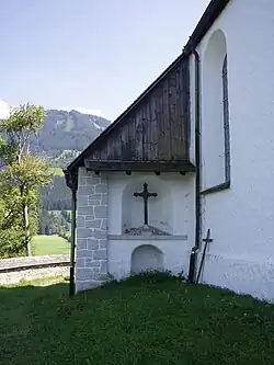 Ein Zugang auf der Südseite des Langhauses wurde vermauert und auf der Außenseite zur Gedenk- und Grabstätte für die Schöllanger Pfarrer umgestaltet. Hier ist auch der Erschließer der Breitachklamm, Johannes B. Schiebel, beigesetzt. Der Friedhof bei der Kirche wird heute noch von den Gemeinden Schöllang, Rubi, Reichenbach, Au, Ober- und Unterthalhofen genutzt. Die meisten Gräber sind traditionsgetreu nach Osten ausgerichtet. Teile der alten Umfassungsmauer aus Roll- und Bruchsteinen mit Schindeldeckung sind erhalten. Außerhalb des Friedhofs südlich der Kirche befindet sich die einzige erhaltene Kreuzwegstation aus dem 18. Jahrhundert.