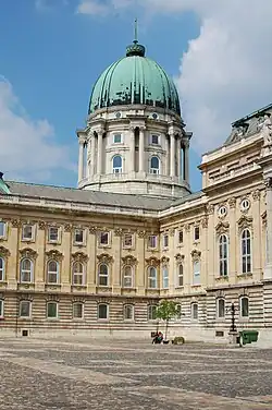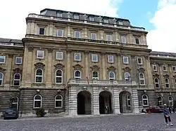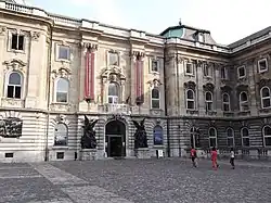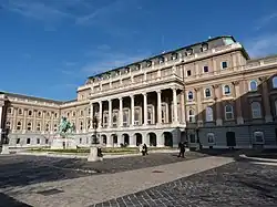 Ihre neubarocke Gestaltung erhielt die Budaer Burg in den Jahren 1891 bis 1905 durch König Franz Joseph I. von Architekt Alajos Hauszmann, der als Nachfolger des 1891 verstorbenen Hofbaumeisters Miklós Ybl diente. Im Zuge dieses Umbaus entstand im 300 Meter langen Donauflügel eine monumentale Raumfolge, bestehend aus Vorhalle, Großer Tanzsaal, Buffetgalerie, Habsburgersaal und Zeremoniensaal. Der rückwärtige Christinenstädter Flügel verfügte über eine weitere repräsentative Raumfolge, bestehend aus Vorhalle, Haupttreppe, Sankt-Stephan-Saal und König-Matthias-Saal. Zwischen beiden Flügeln lag die Burgkapelle. Gegenüber schlossen sich oberhalb das Hauptwachegebäude (Főőrség) und das Stallgebäude (Istállóépület) sowie unterhalb der Reitsaal (Lovarda) an.[3] Die Burg hatte sich nun zur Vierflügelanlage gewandelt.