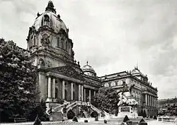 Schon von weitem ist die Kuppel des Palastes zu erkennen, die nach dem Krieg im neuklassizistischen Stil wieder errichtet wurde. Die ursprüngliche Kuppel war neubarock und wurde von einer stilisierten Stephanskrone bekrönt, fiel allerdings wie viele Teile des Gebäudekomplexes zum Ende des Krieges den Flammen zum Opfer.