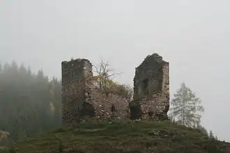 Die einst vier Geschoße des rechteckigen Doppelturmes wurden in der ersten Hälfte des 13. Jahrhunderts errichtet, die ältesten Bauteile gehen wahrscheinlich auf das Ende des 12. Jahrhunderts zurück. Im Untergeschoß befinden sich zwei durch einen tonnengewölbten Gang getrennte gewölbte Räume, im ersten Obergeschoß finden sich noch Spuren der Burgkapelle.
