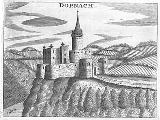 ![]() Ruine Dornach um 1674, Stich von G.M.Vischer | ||