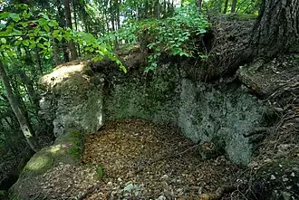 Außenansicht der vermuteten Küche mit dem Ausgussstein in der Öffnung rechts unten