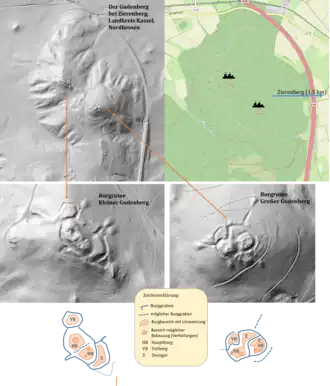 ![]() Lage, Reliefdaten und Umzeichnung der Gudenberg Burgruinen | ||