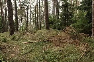 Burgstall Rascher Berg – Ansicht des äußeren, heute stark verflachten Wallgrabens (August 2013) | ||
