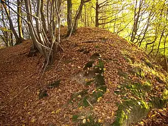 Burgstall unter Bäumen. Reste einer Schildmauer -