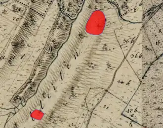 Lageplan des Burgstalls Mühleck (rechts oben) und der Abschnittsbefestigung Haselleite (links unten) auf dem Urkataster von Bayern | |