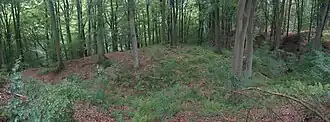 ![]() Burghügel (hangabwärts fotografiert) mit dem im Vordergrund erkennbaren bogenförmigen Halsgraben. | ||