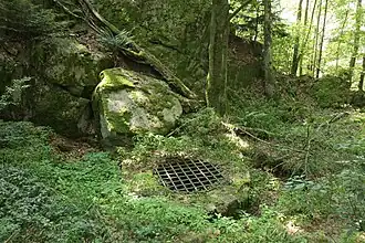 Burgstall Warberg – Schichtwasserbrunnen im Halsgraben (Juli 2013) | ||