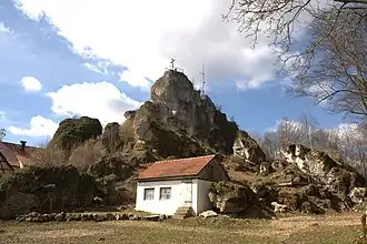 Burgstall Wichsenstein – Ansicht des Burgfelsens über dem Dorf aus südlicher Richtung (März 2011) | ||
