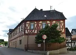 Der langgezogene und abgewinkelte traufseitige Bau hat am Obergeschoss eine vier- und dreizonige Fachwerkwand mit hohen Mannfiguren und unter den Brüstungen Andreaskreuze, Rauten und Schweifstreben. Über der Tür ist eine Inschriftentafel mit der Jahreszahl 1711 angebracht.