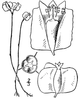 Die an einem nur bis zu 1 Millimeter langen Blütenstiel stehenden Blüten sind entlang der Blütenröhre dreigeflügelt und 3 bis 6 Millimeter hoch. Die Flügel sind blau und jeweils bis zu 2,5 Millimeter breit. Die blaue bis violette Blütenhülle ist sechslappig, die Lappen cremefarben. Die äußeren Lappen sind dreieckig und 0,5 bis 1 Millimeter lang, die inneren aufrecht, elliptisch und 0,4 bis 0,8 Millimeter lang. Die Kapselfrucht ist 2 bis 3,5 Millimeter lang.