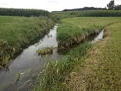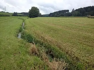 Unterlauf des Burraubachs auf Höhe von Litzelbach, bereits im Tal des Kehlbachs unmittelbar vor seiner Mündung in denselben (Blick bachaufwärts). | ||