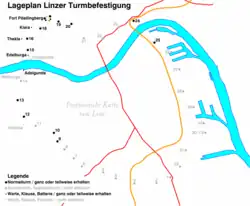- ↑ Erich Hillbrand: Die Türme von Linz. Ein Festungssystem aus dem 19. Jahrhundert. In: Historisches Jahrbuch der Stadt Linz 1984. Linz 1985, ISSN 0440-9736, S. 11–213 (als Sonderabdruck: Die Türme von Linz. Erzherzog Maximilians Festungssystem für die Monarchie. Archiv der Stadt Linz, Linz 1985), ooegeschichte.at [PDF].