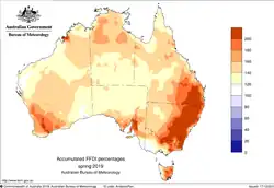 Die Brände wurden durch außergewöhnliche Dürre und Hitze begünstigt. So war 2019 in Australien sowohl das heißeste als auch das trockenste Jahr seit dem Beginn nationaler Wettermessungen 1910. Bereits seit 2017 herrscht in Australien eine mehrjährige Dürre.[16] 2019 fielen im Schnitt nur 277 mm Regen, der niedrigste Wert seit Beginn der Messungen und etwa 40 Prozent weniger als in einem normalen Jahr und noch einmal 11 Prozent weniger als 1902, dem vorher trockensten Jahr. Zudem war es 2019 mit 1,52 Grad über dem langjährigen Durchschnitt auch außergewöhnlich heiß, in New South Wales lag die Temperatur sogar 1,95 Grad über dem langjährigen Durchschnitt und damit 0,3 über dem bisherigen Rekordjahr 2018. Der Dezember 2019 war der trockenste Monat seit Aufzeichnungsbeginn, in dem auch die sechs heißesten jemals in Australien gemessenen Tage vorkamen. An elf Tagen wurden kontinentweit gemittelte Maximaltemperaturen von über 40 Grad Celsius gemessen; zwischen 1910 und 2017 hatte es nur vier solche Tage gegeben. Im Dezember 2019 erreichten mehr als drei Viertel des Landes absolute Rekordwerte bei der Feuergefahr, während der Rest des Landes weitestgehend sehr deutlich über dem Durchschnitt lag (entsprechend den obersten 10 Prozent der Skala).[17] Der Sommer 2019/20 war zudem mit einer Temperatur von 1,88 °C über dem langjährigen Durchschnitt der zweitheißeste seit Beginn der Messungen in Australien.[18] Bereits Mitte 2019 sagten Klima- und Wettermodelle eine schwere Brandsaison voraus, Prognosen, die sich im Nachhinein als zutreffend erwiesen.[5]