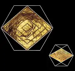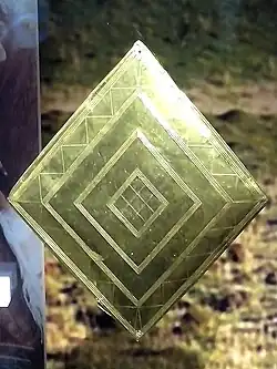 - Das kleinere Goldblech zeigt mehrere ineinander gefügte Rauten, die je nach Blickwinkel wie Quadrate wirken.