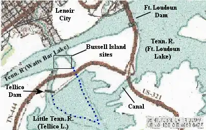 Die TVA erneuerte ihr Interesse am Bau der Fort Loudoun Extension – das inzwischen in Tellico Dam umbenannte Projekt – 1964, obwohl sich aus einer Gruppe von Umweltschützern, Denkmalschützern und Indianern augenblicklich Widerstand gegen das Projekt erhob.[15] Der Bau des Staudammes begann 1969, doch die Fertigstellung wurde durch Gerichtsverfahren bis 1979 verzögert, was der University of Tennessee noch umfangreiche Ausgrabungen im Tellico Basin erlaubte. Als Ergebnis dieser Ausgrabungen wurden mehrere Stätten wegen ihres archäologischen Potentials in das National Register of Historic Places aufgenommen, darunter auch Bussell Island, 40LD17.[16]
