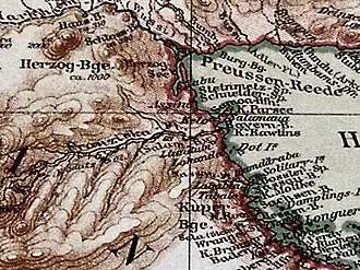 ![]() Huongolf mit Busu River mittig am oberen Bildrand in Papua-Neuguinea. Kartenausschnitt aus dem Deutschen Kolonialatlas, 1910. | ||