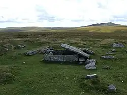 In der Nähe des Gipfels liegt umgeben von größeren Steinen, die keine Ordnung erkennen lassen, eine komplette halb eingetiefte Steinkiste. Die Längsseitensteine werden von den zwischengesetzten Kurzseitensteinen gestützt. Der Deckstein liegt schräg auf. Die Reste eines Hügels sind erkennbar.