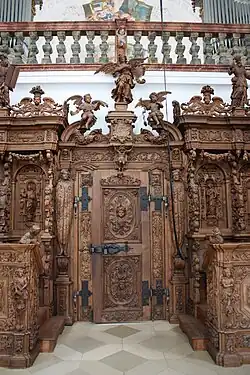 Die beherrschende Figur der Westseite ist die des Erzengels Michael über dem Eingangsportal. Sie stammt von einem anderen Schnitzer als die übrigen Gesimsfiguren, wirkt schwerfälliger und mehr der Tradition verhaftet.[27] Der Erzengel steht auf einem erhöhten Postamentaufbau und überragt die anderen Statuen trotz Tieferlegung des Portals bei der Barockisierung. Mit seiner rechten Hand zeigt er auf den Schild in seiner linken mit den Worten QUIS UT DEUS (Wer ist wie Gott?), der lateinischen Form des Namens Michael. Es bedeutet, dass Gott allein die Herrschaft gebührt. Auf dem Postament steht auf einer herzförmigen Fläche der Eigenname Gottes in hebräischen Buchstaben, das Tetragramm, umgeben von den Köpfen der vier Lebewesen, die nach der Offenbarung des Johannes Gottes Thron umstehen. Sie gleichen einem Löwen, einem Stier, einem Menschen und einem Adler und preisen die Heiligkeit Gottes. Ihr Lobgesang steht auf den Spruchbändern, die zwei Engel halten: Sanctus, sanctus, sanctus Dominus Deus Sabaoth. Das letzte Wort lautet abweichend von (Offb 4,8 ) nicht „omnipotens“, sondern „Sabaoth“ und weist so auf den Mess-Gesang der katholischen Liturgie hin. Auf der Frieszone des Portals, die ursprünglich mit der des Gestühls auf gleicher Höhe war, sind die vier Jahreszeiten dargestellt. In der Mitte trägt ein Atlant das Postament des Erzengels Michael. Links von ihm quellen aus zwei Füllhörnern Blumen und Getreideähren, Symbole für Frühling und Sommer, rechts verweisen Weintrauben auf den Herbst und ein Mönch, der seine Hände über einem Feuer wärmt, auf den Winter. Kunstvoll verschnörkelt ist mit der Zahl 1691 zwischen den Jahreszeiten das Datum der Fertigstellung des Chorgestühls eingefügt. Die Tür, die mit Engelsköpfen verziert ist, wird von zwei Cherubim flankiert. Abweichend vom erhöht aufgestellten Gestühl steht das Eingangsportal direkt auf dem Steinboden.