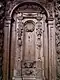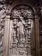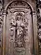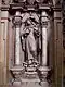 Der Eingang wird von Christus und Maria flankiert. Christus ist südlich des Portals, auf der Epistelseite, mit der Weltkugel in der linken Hand als Salvator mundi dargestellt. Seine Rechte ist zum Segnen ausgestreckt. Diese Stalle ist für den Prior bestimmt. Auf der Evangelienseite rafft Maria mit der Linken ihr überlanges Gewand etwas hoch, während die rechte Hand auf ihrer Brust ruht. Die Plätze neben Christus sind Elija und Paulus von Theben gewidmet. Der alttestamentliche Prophet Elija, der von den Karmeliten als ihr Ordensstifter verehrt wird, tritt mit seinem linken Fuß auf einen abgeschlagenen bärtigen Kopf. Dieses Attribut steht in Bezug zum Gottesurteil auf dem Karmel, als Elija nach seinem Sieg über die Propheten des Baal diese töten ließ (1 Kön 18,16–40 ). Der Platz des Paulus von Theben ist leer, seine Statue verloren gegangen, nur die Inschrift auf der Namenskartusche erinnert an ihn. Er war der erste Einsiedler und wurde zum Vorbild für die Pauliner. Die Statue von Johannes dem Täufer ist verschollen. Besondere Verehrung brachten ihm die Einsiedler vom heiligen Johannes entgegen, ein Orden, der 1575 von Papst Gregor XIII. bestätigt wurde. Der Name des Täufers auf der Kartusche zeigt an, dass er den Platz neben Maria innehatte, gefolgt von Antonius dem Großen, dem Vater des abendländischen Mönchtums, leicht zu erkennen am Antoniuskreuz auf seinem Umhang und dem Glöckchen in seinen Händen. Auf ihn berufen sich die Antoniter. Sie machten mit dem Läuten des Antoniusglöckchens bei Sammlungen für ihre Spitäler aufmerksam.[27]