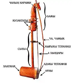 Somit ähnelt die byzaanchy der zweisaitigen chinesischen erhu und der einsaitigen endingidi in Uganda. Ein anderes tuwinisches Streichinstrument ist die zweisaitige Langhalslaute igil.