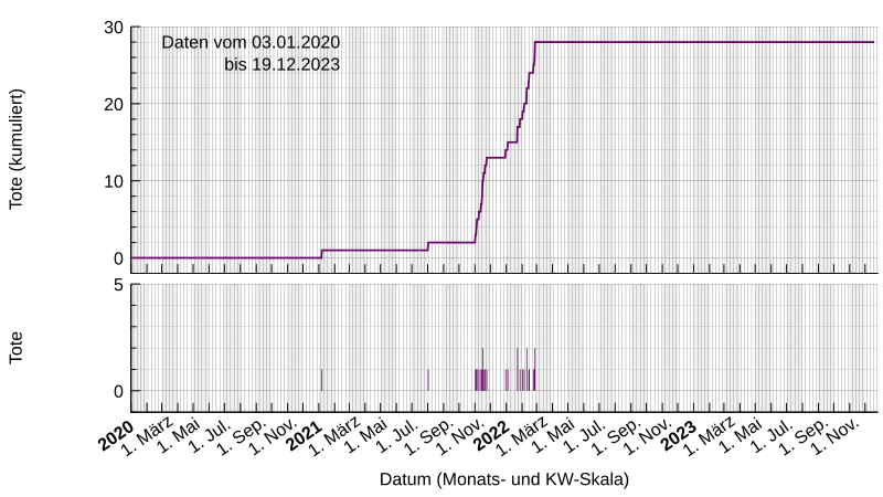 Am 6. Januar 2021 kam es erstmals zu einem coronabedingten Todesfall auf den Färöern, als ein vorerkrankter 68-jähriger Mann im Krankenhaus verstarb.[19] Ein zweiter Todesfall wurde der WHO rund sieben Monate später am 2. Aug. 2021 gemeldet.[20]