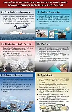 Bis Ende Februar 2021 erhielten fast 890.000 Einwohner (59 % der Osttimoresen) von der Regierung eine Grundnahrungsmittelhilfe, im Wert von 50 US-Dollar pro Person.[151] Am 24. März wurde ein weiteres Hilfspaket von der Regierung verabschiedet. Mit 210,6 Millionen Dollar finanzierte man unter anderem Unterstützungen für Unternehmen, eine Sonderauszahlung an Arbeitslose sowie ein Kreditmoratorium und Maßnahmen im Gesundheitsbereich.[152]