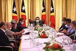Nach Sitzungen von Staatsrat und Sicherheitsrat (bei dem Danina Coelho, der Arzt und ehemalige Premierminister Rui Maria de Araújo und Daniel Santos, Direktor von FONGTIL als Gäste geladen waren)[110] stimmte Staatspräsident Guterres der Ausrufung des Ausnahmezustandes zu.[111] In letzter Instanz stimmten am 26. März 2020 auch die Abgeordneten des Nationalparlaments einstimmig für die Verhängung des Ausnahmezustands ab dem 27. März um Mitternacht bis inklusive des 26. April.[112] Am Tag zuvor hatte sich noch die Zerstrittenheit der Parteien im Parlament widergespiegelt. Anträge der Regierung für die Freigabe zusätzlicher Finanzmittel wurden von der neuen Mehrheitskoalition abgelehnt, obwohl noch immer Mitglieder zweier der Parteien Kabinettsmitglieder sind und dort für die Anträge gestimmt hatten.[113]