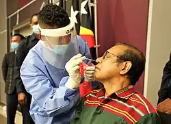 Obwohl das Terminal des Flughafens Dili durch die Katastrophe am Vortag überflutet war, konnte am 5. April ein Flugzeug die ersten 24.000 Impfdosen nach Osttimor bringen. Mit den Impfungen wurde am 7. April begonnen.[133][134] Demonstrativ ließen sich der Premierminister und die Präsidenten von Parlament und Obersten Gericht impfen. Dann folgten die anderen Mitglieder der Regierung, die Parlamentsabgeordneten, der Erzbischof von Dili, Virgílio do Carmo da Silva und Friedensnobelpreisträger José Ramos-Horta. Geimpfte erhielten einen gelben Covid-19-Impfausweis. Der Impfstoff von AstraZeneca stammte aus dem internationalen Covax-Fonds und wurden in Südkorea produziert. Die ersten 20 % der Impfdosen (100.800 Einheiten), die Osttimor benötigt und vom Fonds finanziert werden, sollen an Bewohner in den Grenzgebieten verabreicht werden. AstraZeneca wurde ausgewählt, da die Lagerung zwischen 2 und 8 °C relativ leicht ist. Da andere Impfstoffe kältere Temperaturen benötigen, ist die Verteilung in Osttimor nicht möglich. Daher werden im Land Personen jeden Alters mit AstraZeneca geimpft. Die Impfdosen reichen schätzungsweise für 263.000 Menschen, inklusive 39.450 Personen, die aufgrund ihres Berufs in Gefahr stehen, mit Infizierten in Kontakt zu kommen und 65.750 Menschen mit chronischen Krankheiten. 105.200 Empfänger sind Personen, die älter als 60 Jahre sind und Personen der zweiten Kategorie, wie Lehrer, Priester und andere. Die Impfungen sind für Einheimische und im Lande wohnende Ausländer kostenlos.[135][136][137][138] Im Oktober 2021 besuchten viele Regierungsmitglieder in einer Kampagne die einzelnen Sucos, stellten sich den Fragen der Bevölkerung und warb für Impfungen. Im Anschluss der Veranstaltungen wurden direkt Impfungen angeboten, so dass Mitte November drei Viertel der Bevölkerung eine erste Impfung hatten.