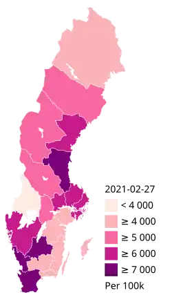 Die COVID-19-Pandemie in Schweden trat ab Januar 2020 als regionales Teilgeschehen des weltweiten Ausbruchs der Atemwegserkrankung COVID-19 auf und beruhte auf Infektionen mit dem Ende 2019 neu aufgetretenen Virus SARS-CoV-2 aus der Familie der Coronaviren. Die COVID-19-Pandemie breitete sich ab Dezember 2019 von der chinesischen Metropole Wuhan, Provinz Hubei ausgehend aus.[3][4] Ab dem 11. März 2020 stufte die Weltgesundheitsorganisation (WHO) das Ausbruchsgeschehen des neuartigen Coronavirus als Pandemie ein.[5]