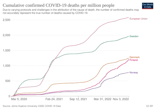 - ↑ a b c Richard Orange: FACT CHECK: Did Sweden have lower pandemic mortality than Denmark and Norway? In: thelocal.se. 10. März 2023, abgerufen am 18. März 2023 (englisch): „"It's very difficult to compare countries and the longer the pandemic goes on for the harder it is, because you need a proper baseline, and that baseline depends on what happened before," Karin Modig, an epidemiologist at Swedens's Karolinska institute whose research focuses on ageing populations, told The Local […] „My interpretation is that in the first year of the pandemic, say March 2020 – February 2021, Sweden had several thousand excess deaths among the elderly, including nursing home residents,“ he [Prof. Preben Aavitsland] said. „Most of this was caused by Covid-19. In the other [Nordic] countries, more people like these survived, but they died in 2022. The other countries manged to delay some deaths, but now, three years after, we end up at around the same place.““