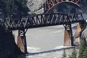 Die Flussquerung ist seit 1885 Teil der transkontinentalen Eisenbahnstrecke Montreal-Vancouver der CPR. Die erste Konstruktion war eine von Charles Conrad Schneider entworfene Gerberträger-Fachwerkbrücke, die 1882–1884 errichtet wurde. Mit der Entwicklung immer leistungsstärkerer Dampflokomotiven Anfang des 20. Jahrhunderts, musste der Überbau 1910 durch eine Konstruktion für höhere Traglasten ersetzt werden. Durch eine spezielle Unterkonstruktion des mittleren Fachwerkträgers war bei gleichbleibender Höhe der Gleisebene die Verwendung der ursprünglichen Brückenpfeiler möglich. Der alte Überbau wurde demontiert und für die Niagara Canyon Bridge der Esquimalt and Nanaimo Railway auf Vancouver Island weiterverwendet.