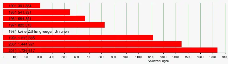 | Jahr | Buddhisten | Christen | Hindus | Jainas | Muslime | Sikhs | Andere | keine Angaben | Gesamt | |||||||||