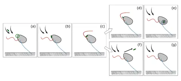 Schematische Darstellung der Nahrungssuche von C. roenbergensis oder C. burkhardae; a–c: Suche und Fang, d–e: Aufnahme der Beute bzw. f–g: Zurückweisung. Vordere Geißel (rot), hintere Geißel (blau), Aufnahmebereich (grüner Kreis), Nahrungsstrom (gekrümmte Pfeile), Objektbewegung (gerade Pfeile).Schematische Darstellung der Nahrungssuche von Cafeteria cf. mylnikovii (früher Pseudobodocf.tremulans); Bezeichnungen wie oben, zusätzlich h–i: Peitschen-Abstoßung (lash rejection). Die vordere Geißel dient als „Peitsche“.
