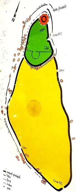 Die Anlage erstreckt sich auf einer Fläche von etwa 30 Hektar auf einem Plateau und besteht aus zwei angrenzenden Bereichen: